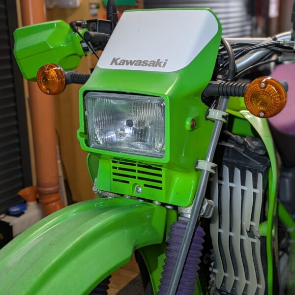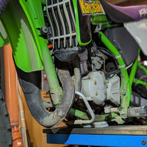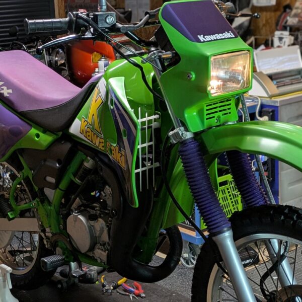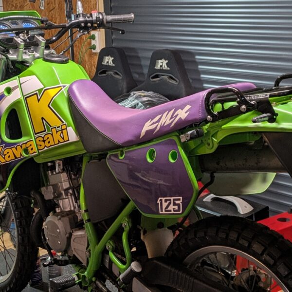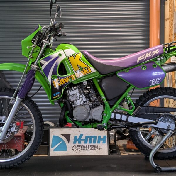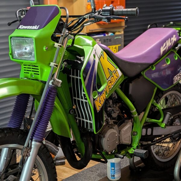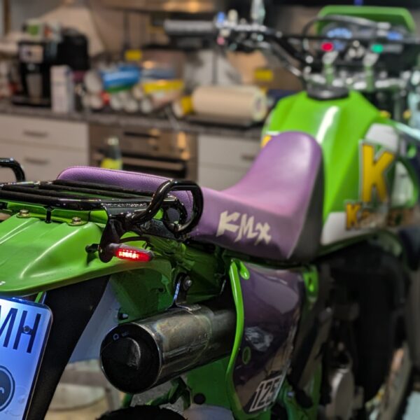 Die Kwasaki KMX 125 ist eine 2-Takt Enduro, leicht, handlich und dank Auslasssteuerung relativ durchzugsstark. Der wassergekühlte Zweitakt-Einzylindermotor lässt sich easy ankicken und entwickelt eine Leistung (meines Wissens) von maximal 13 KW. Die Sitzhöhe von ca. 86 cm ist ideal geeignet für Fahrerinnen und Fahrer ab einer Größe von ca. 170 cm. Mein Ziel beim Umbau ist es, die recht poppig daherkommende KMX viel mehr nach Hard- oder Wettbewerbsenduro aussehen zu lassen (Competition kurz „Comp“). Durch kaum wahrnehmbaren Miniblinker, der neuen Farbgebung auf den Startnummernfeldern und den grobstolligen Reifen, wirkt die KMX nach dem Umbau wie ein ganz anderes Motorrad. Viel sportlicher, viel cooler.