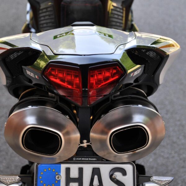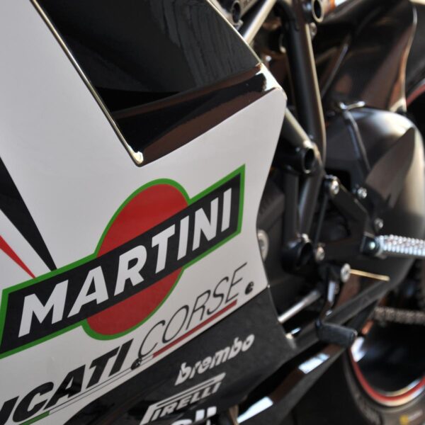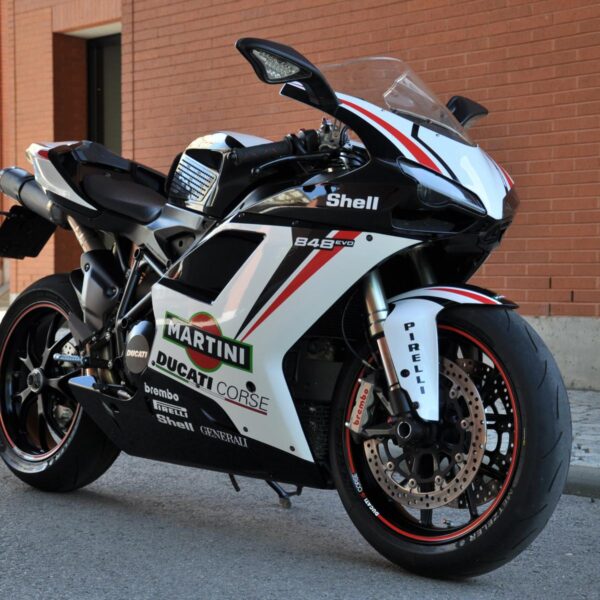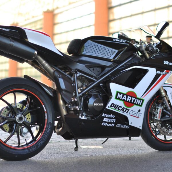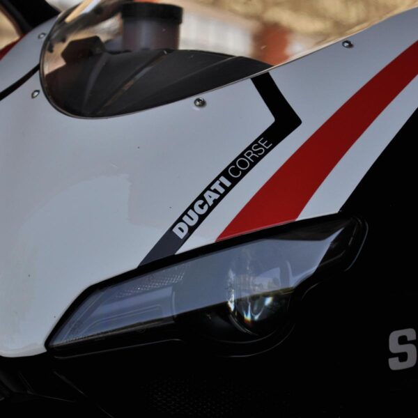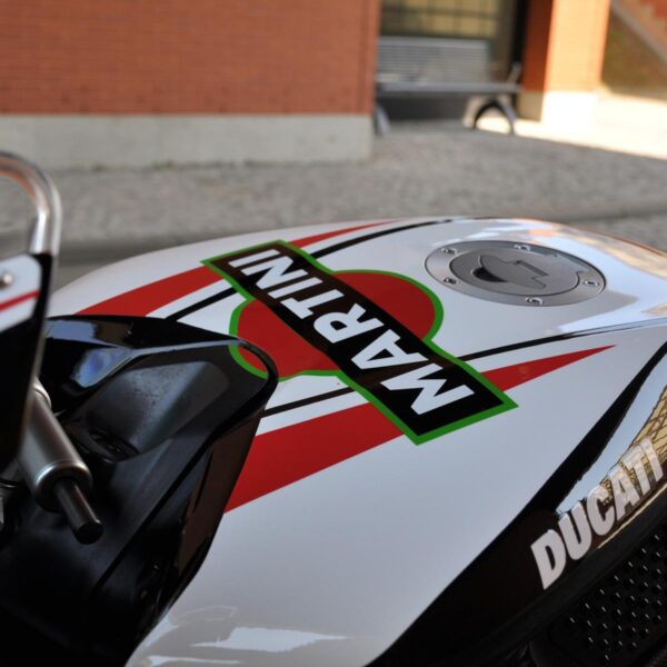 Ich liebe Sportmotorräder, und mit meinem geringen Kampfgewicht genügen mir Supersport-Motorräder um die 140 PS locker. Eine solche „Mittelklasse“ Sportlerin ist die Ducati 848 Evo. Ich kaufte sie mir gebraucht in „Dark Stealth“ sprich in schwarz matt. Die Duc war in dieser „Farbe“ von Grund auf etwas günstiger zu bekommen als in glänzendem weiss oder rot. An und für sich war an diesem Motorrad serienmäßig schon alles recht geil, nur das schwarz matt gefiel mir nicht besonders. So entschied ich mich das Motorrad mit Klarlack zu veredeln. Doch bevor der Lack auf die Teile kam versuchte ich mich, sozusagen das erste Mal ausführlicher, in der Technik des Folierens. Die Farbgebung lehnte ich damals an eine Martini-Panigale 1199 Tricolore an. Im Detail wurden die Duc noch an vielen weiteren Stellen dezent umgebaut und verbessert (z.B. Öhlins Federbein hinten, Tellert Schaltautomat, Sportauspuff..)