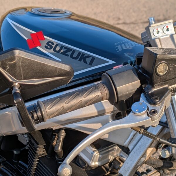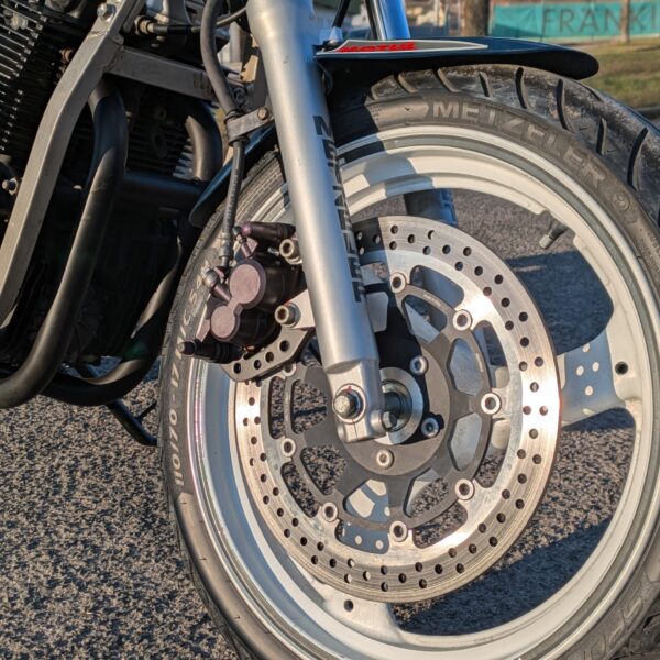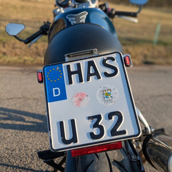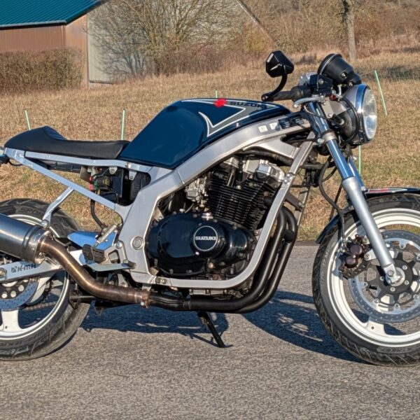 Die Umbaumaßnahmen im Einzelnen: geänderter Kotflügel vorn (kleiner und näher am Rad), für eine sportlichere Optik und für eine sportlichere Sitzposition wurden die Lenkerstummel nach unten montiert (die Stummel können bei Bedarf jederzeit wieder nach oben montiert werden!), mini-LED-Blinker vorn, Lenkerendenspiegel von Raximo, GPR Sportauspuff, gekürztes Rahmenheck, Soziusfussrasten entfernt, Caferacer Sitzbank, geänderter Nummernschildhalter inkl. mini-LED-Blinkern mit integriertem Brems- und Rücklicht, LED-Nummernschildbeleuchtung, mini-Rückstrahler, Tank und Kotflügel neu lackiert und beklebt, analoge Öltemperaturanzeige, und allgemeine 40-Punkte- Durchsicht. Alle Verschleißteile wurden gecheckt und wenn nötig ausgetauscht (Reifen Metzeler Sporttec Street, Batterie, TRW Bremsbeläge, DID Kette… alles in Ordnung!), die Vergaser wurden im Ultraschallbad gereinigt, Bremsflüssigkeit neu, Motoröl mit Filter neu.