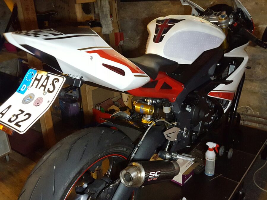 Dadurch wird das originale Rücklicht überflüssig, ebenso die originalen Blinker, welche bei manchen Modellen in die originale Heckverkleidung mit integriert sind, wie z.B. bei meiner Aprilia RSV 1000 RR oder bei einer GSXR 750 K8. Trennt man nun die Kabelverbindungen, lässt sich mit wenigen Handgriffen das Nummernschild samt Beleuchtung, Blinkern, Rücklicht und Rückstrahler entfernen und man erhält ein cleanes Heck im Look eines Rennmotorrads. Jetzt müssen nur noch die Spiegel weg und die Frontscheinwerfer abgeklebt werden. Ich plotte mir hierfür Foliencovers in passender Farbe und Form.